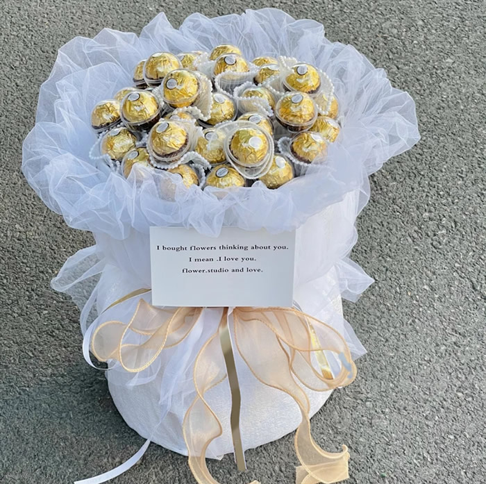 商品簡介:材料33顆費列羅巧克力,帶珠白色網(wǎng)紗裝飾包裝白色軟網(wǎng)紗+白色硬紙圓形包裝,香檳色蕾絲帶+香檳色細緞帶+白色細緞帶束扎