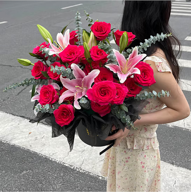 材料包裝: 33支紅玫瑰+2支多頭百合(不少于6朵),綠葉點(diǎn)綴,圍色包裝圍邊,黑色抱抱桶。