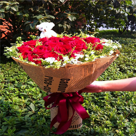 材料包裝: 33枝頂級紅玫瑰+1只小熊 黃鶯、滿天星點綴 包 裝: 經典米色舊報紙手揉紙圓形包裝,酒紅色絲帶花結