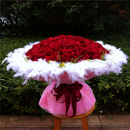 材料包裝: 66支紅玫瑰 ,白色羽毛圍邊,粉色圓形包裝