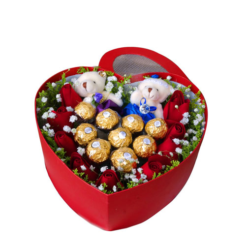 材料包裝: 紅玫瑰9枝+9顆巧克力+男女小熊一對,滿天星飽滿,高檔心型禮盒包裝!