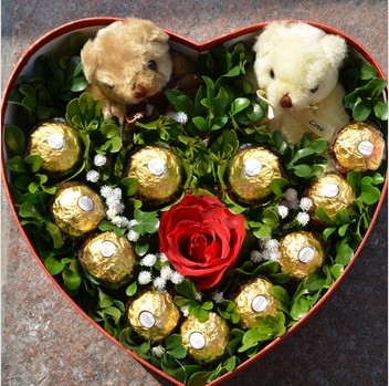 材料包裝: 禮盒包裝,玫瑰花一朵,小熊兩個,11顆巧克力!禮盒顏色隨機(jī)挑選!