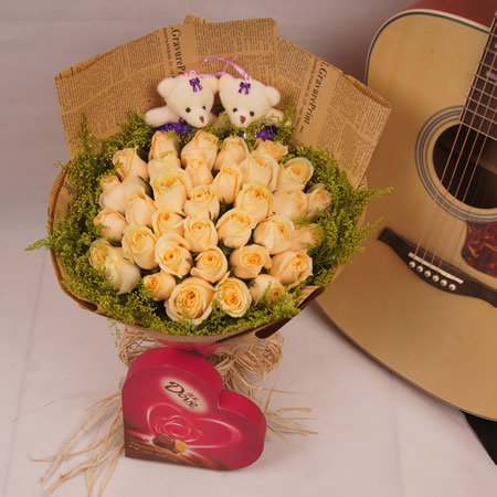 商品簡介:花材:33朵香檳玫瑰,滿天星圍邊,2只卡通小熊,德芙心形巧克力109g一盒;包裝:英文舊報紙圓形加扇形高檔包裝