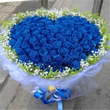 材料包裝: 99支藍(lán)色妖姬 心形包裝滿天星外圍 藍(lán)色紗網(wǎng)包裝.