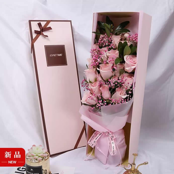 商品簡介:19枝黛安娜粉玫瑰,滿天星,石竹梅點(diǎn)綴,綠草搭配,高檔咖啡色禮盒