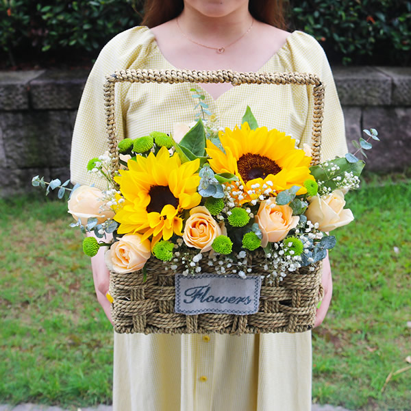 材料包裝: 11朵香檳,2只向日葵,小菊,尤加麗葉,綠葉間插,手提花籃