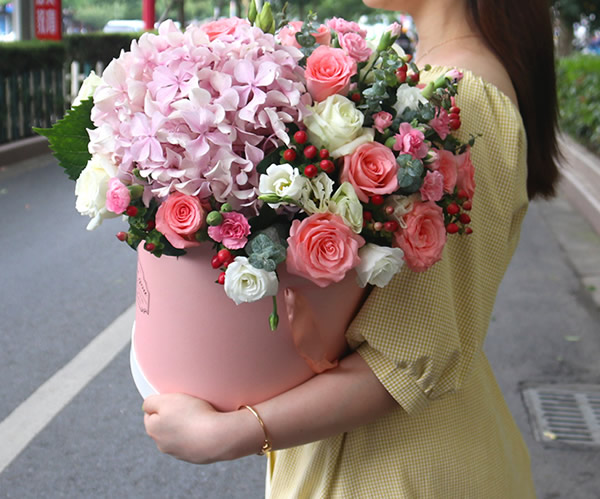 商品簡(jiǎn)介:粉繡球2個(gè),11朵粉玫瑰,11朵白玫瑰,9朵洋桔梗,紅豆,尤加麗葉,抱抱桶粉色
