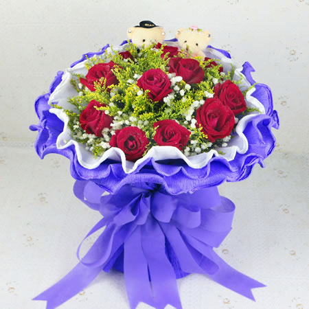 商品簡介:11朵紅玫瑰+2只小熊,黃鶯+滿天星豐滿,白色+藍色卷紙,蝴蝶結裝飾。