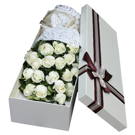 材料包裝: 【白玫瑰高檔禮盒】:19支白玫瑰,綠葉間插,紗網包裝,禮盒盛放(禮盒顏色隨機,以當地發貨為準)