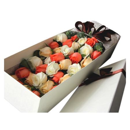 商品簡介:33朵玫瑰混搭,綠葉間插,精美禮盒