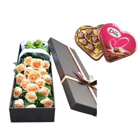 材料包裝: 19枝香檳玫瑰,綠草搭配,白色紗網(wǎng)扎尾,咖啡色禮盒包裝,1盒98g德芙心語