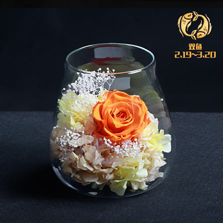 商品簡介:保鮮花:雙魚座,橘色花;主材:1朵5-6CM進口玫瑰;配材:繡球,滿天星;尺寸:12*12CM