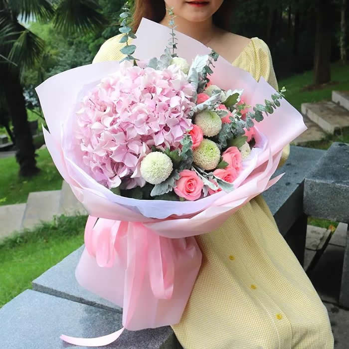 材料包裝: 11枝粉玫瑰6支乒乓菊,繡球2個,尤加利葉,綠葉點綴,高檔包裝。