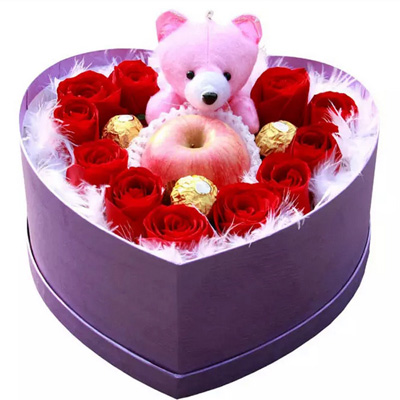 材料包裝: 11朵紅玫瑰+3顆巧克力+1個(gè)平安果+1個(gè)小熊,精美禮盒(禮盒顏色隨機(jī),以當(dāng)?shù)匕l(fā)貨為準(zhǔn))