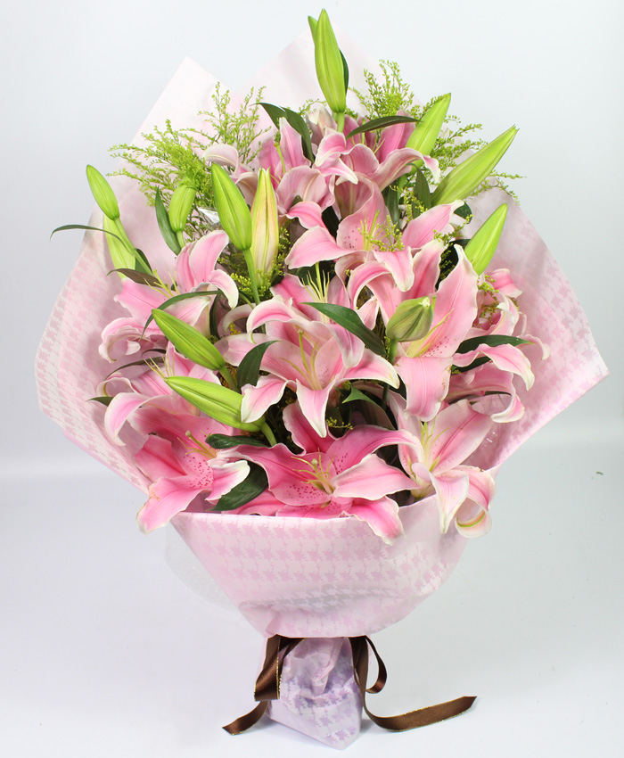 材料包裝: 花材:9支多頭粉色百合,搭配黃鶯;包裝:淡粉色包裝紙扇形包裝,絲帶扎尾